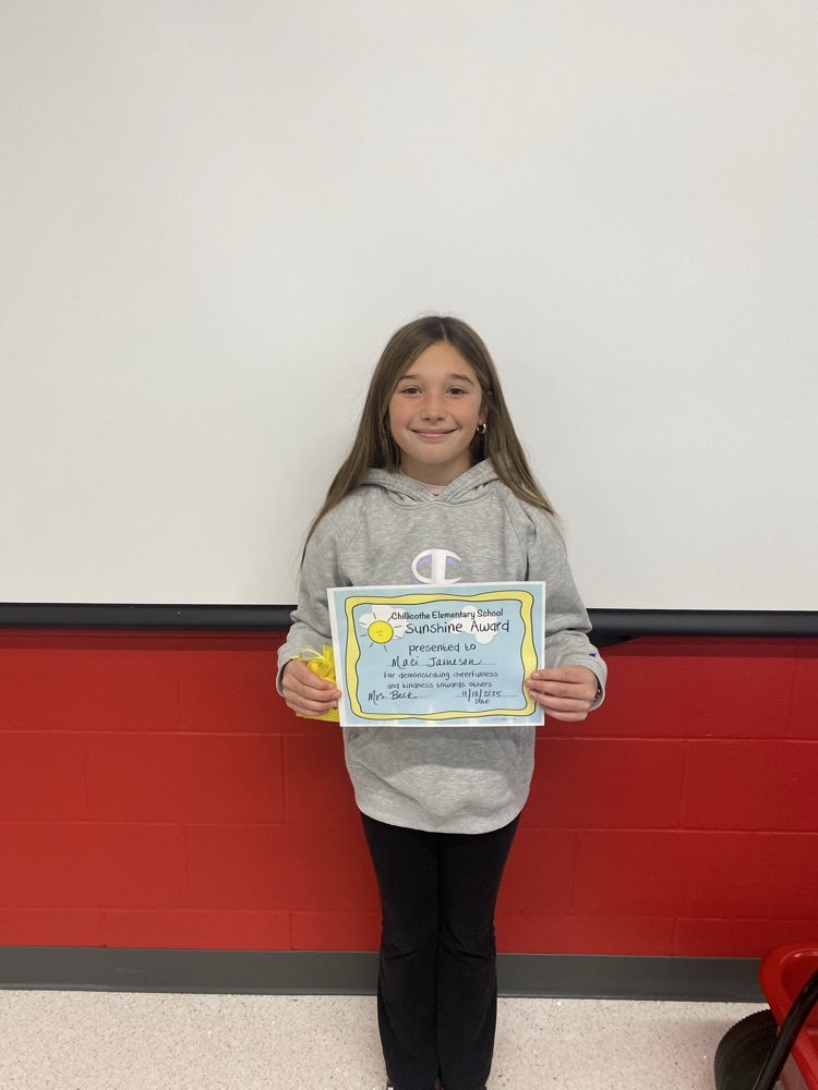 Maci Jameson (Mrs. Beck’s 4th Grade Class)Maci always has a smile on her face. She is always willing to help out whether it is helping a teacher or a friend. Maci asks questions for all to understand. Maci is a great friend and we love her for it!