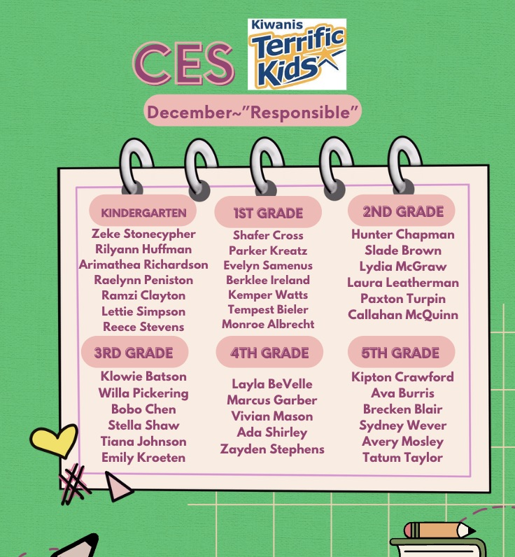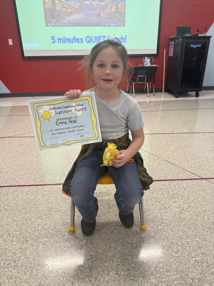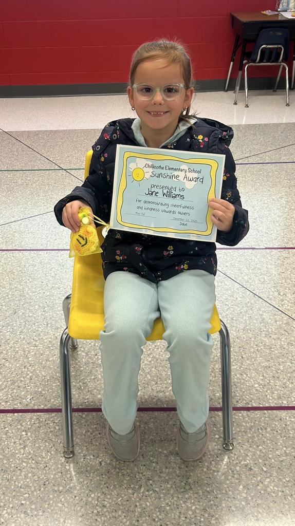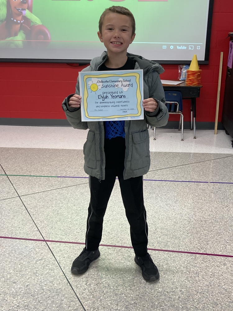 "Let Your Kind Shine” Kindness is everywhere at CES! The three recipients of this week's awards were nominated by a teacher or staff member for showing exceptional kindness. They received a sunshine bag and the opportunity to sit in the yellow sunshine chair over the next week to promote kindness throughout CES! Emma Head (Miss Snyder’s First Grade Class) Emma is a hard worker who always has a smile on her face. She helps out when she sees something that needs done, sometimes without being asked. Way to go, Emma! Jane Williams (Miss Hall’s Second Grade Class) Jane is always willing to help others that need it! She is up for any extra task that is helpful and is a wonderful friend to everyone! Elyjah Yeomans (Mrs. Dodson’s Fourth Grade Class) Elyjah is always helping out other friends! He is so inclusive of his classmates, as well as other students that may not be included in a game/activity. When someone drops something or needs help knowing what to do next, he always steps in and helps in a kind and calm manner. Mrs. Dodson’s class is so glad to have someone like Elyjah in our room!