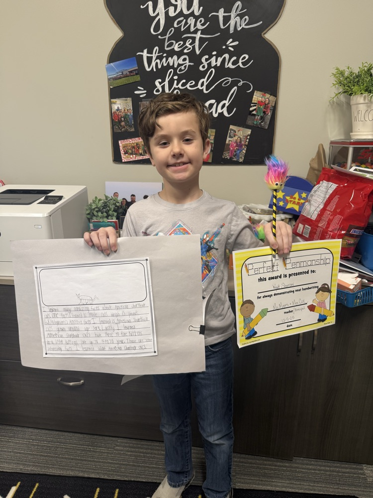 Perfect Penmanship Award goes to Wyatt Sherrow for outstanding handwriting on the Informational Report on American Shorthair Cats