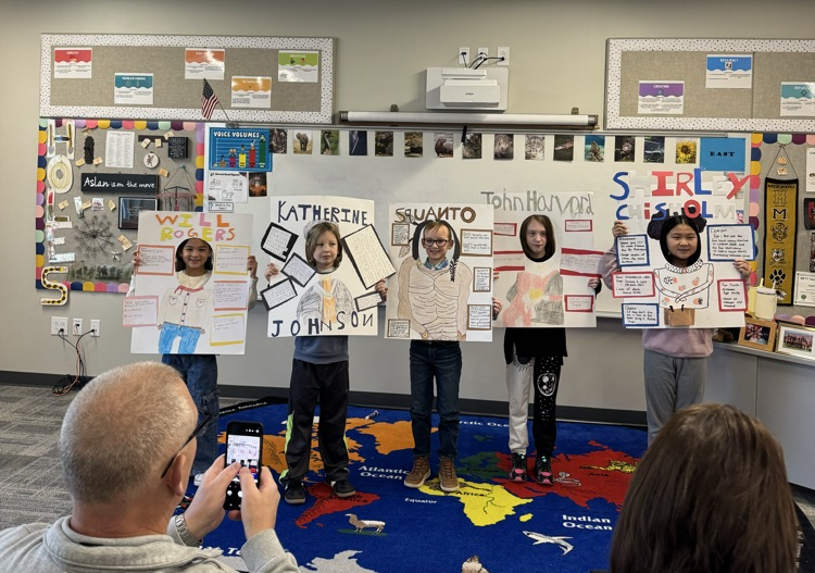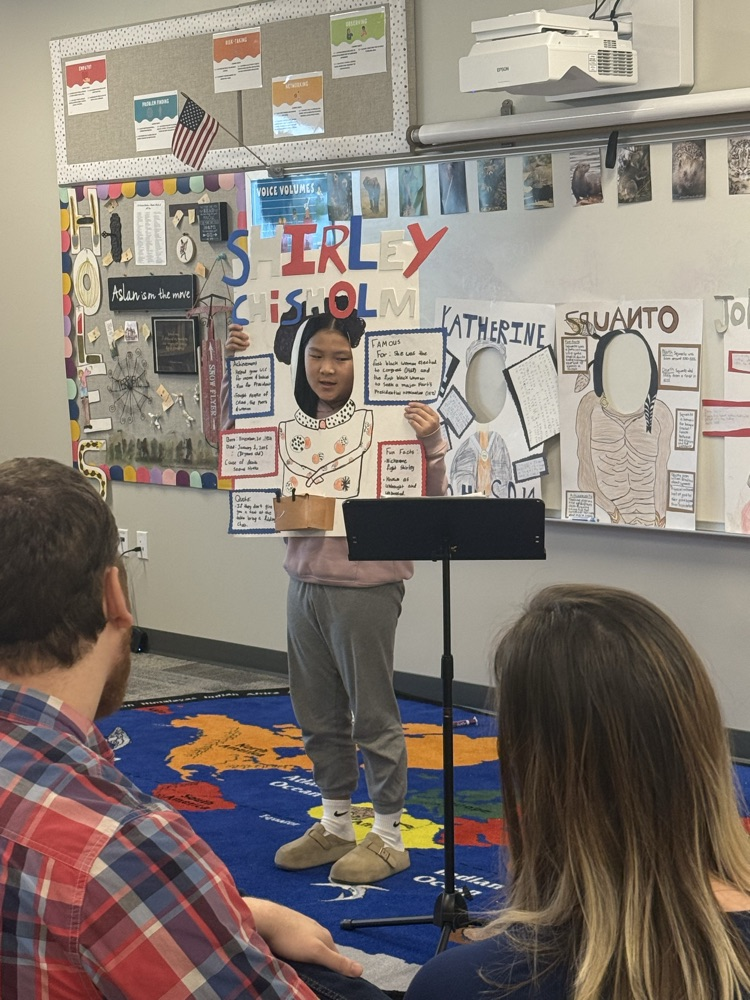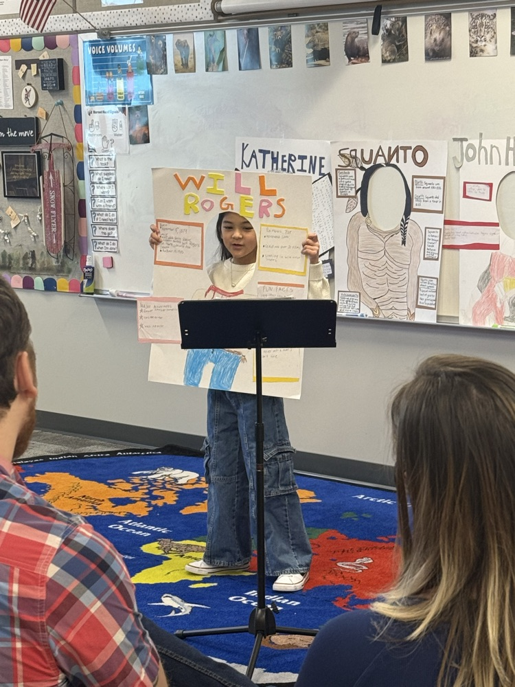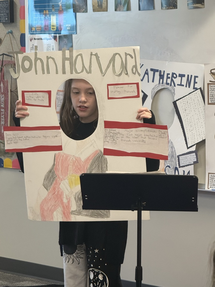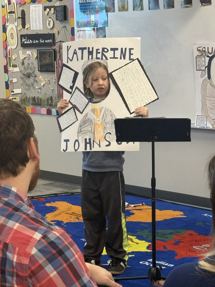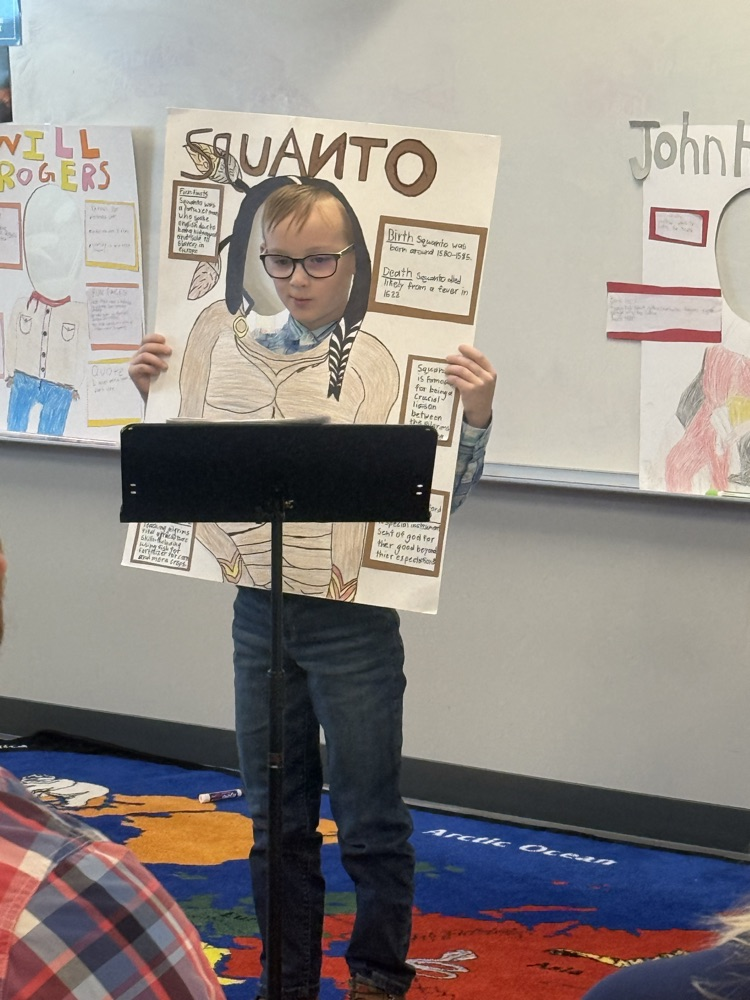 Today, the third grade WINGS class finished their Famous American research projects. Each child chose a lesser-known American of merit about whom they researched, wrote a report, created a poster, and presented a live speech for parents and grandparents. Americans covered included Will Rogers, Katherine Johnson, Shirley Chisolm, Squanto, and John Harvard.