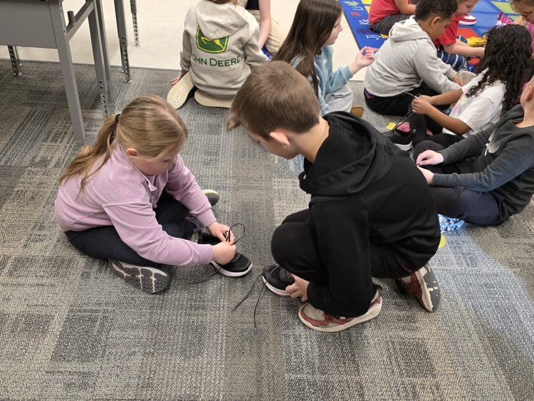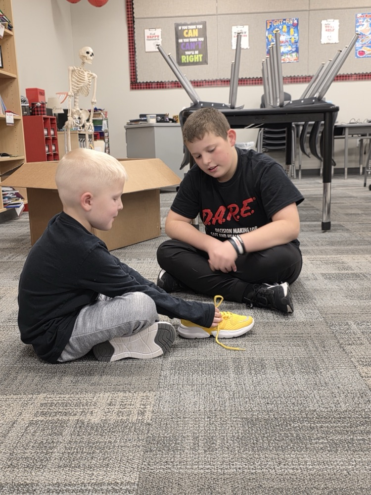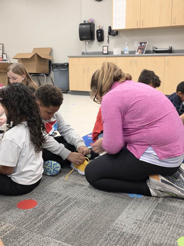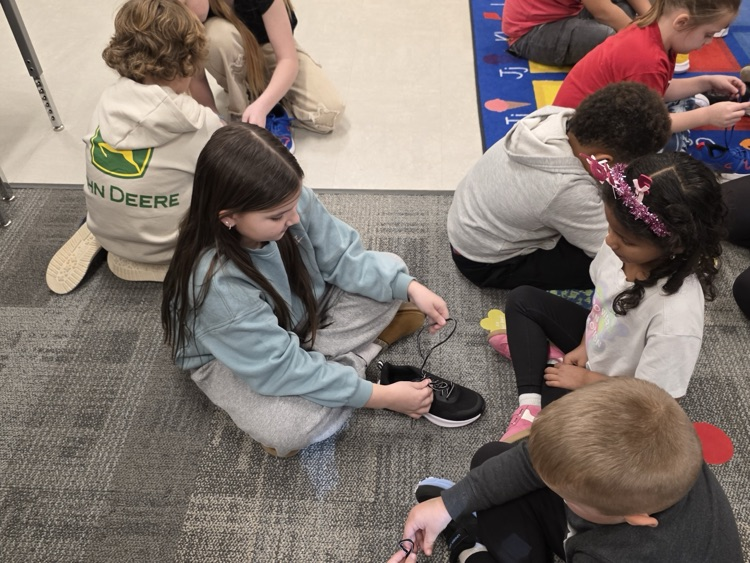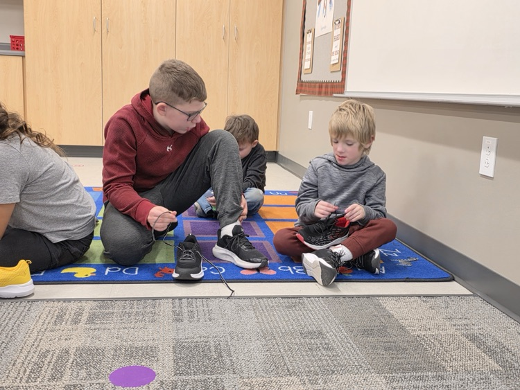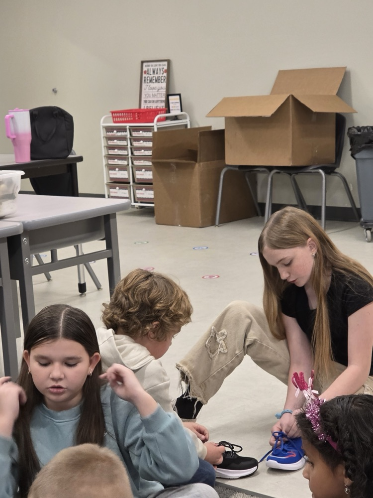All aboard the “Shoe Shoe Train!” 🚂👟 Our big 5th graders are helping our littles learn to tie their shoes — leadership, kindness, and teamwork in action!